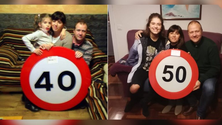 Pero no es una señal cualquiera. Es una señal de límite de velocidad que coincide con los años que cumple la homenajeada. En las dos fotografías, se aprecia a la mujer con una señal con el número 40 y otra con el número 50.