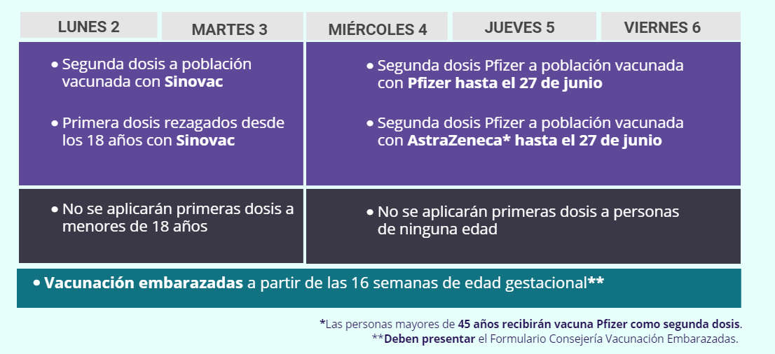 - Viernes 6: Segunda dosis población vacunada con Sinovac/ Segunda dosis Pfizer a población vacunada con AstraZeneca* hasta el 27 de junio / NO se aplicará primera dosis a personas de ninguna edad