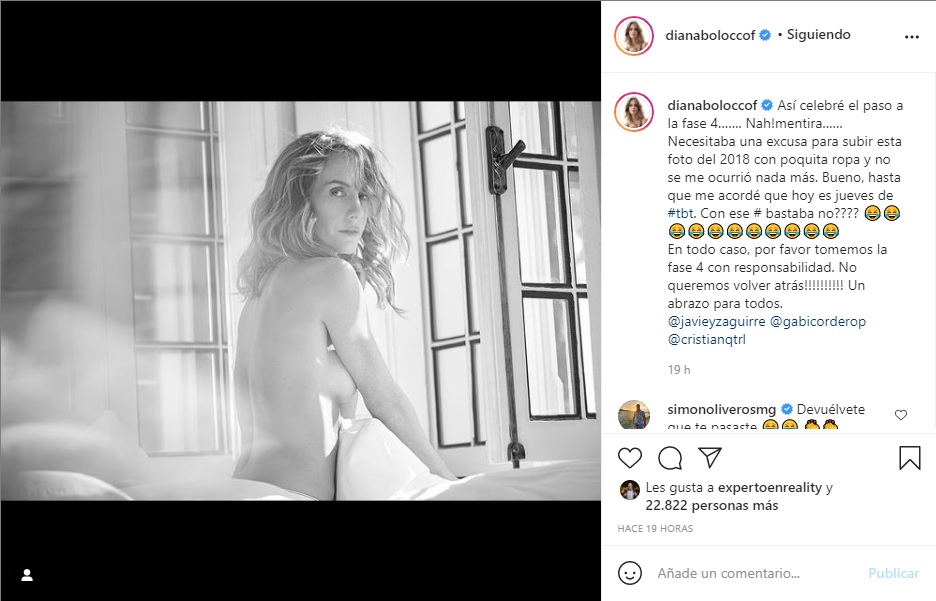 «Así celebré el paso a la fase 4……. Nah! mentira…… Necesitaba una excusa para subir esta foto del 2018 con poquita ropa y no se me ocurrió nada más» comenzó escribiendo Diana para acompañar la osada postal en la que deja casi nada a la imaginación.