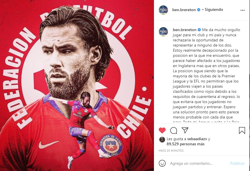 «Me da mucho orgullo jugar para mi club y mi país y nunca rechazaría la oportunidad de representar a ninguno de los dos. Estoy realmente decepcionado por la posición en la que me encuentro, que parece haber afectado a los jugadores en Inglaterra mas que en otros países», inició Ben Brereton en su red social.