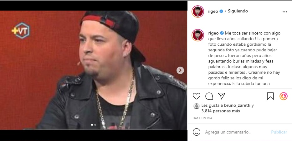 «Créanme la lucha con el peso es de todos los días, jamás siento que le gane jamás. Es más siempre siento que el tiene el paso delante mío esperando para volver. Cuando vean a alguien que sufre cambios violentos de físico o de ánimo hablen con ellos, pregunten si sienten pena o pasan por algo. A veces las heridas internas sangran mucho más que una superficial! Y también acotar que no todos los cuerpos lindos por fuera son igual de bellos por dentro», sentenció Rigeo.