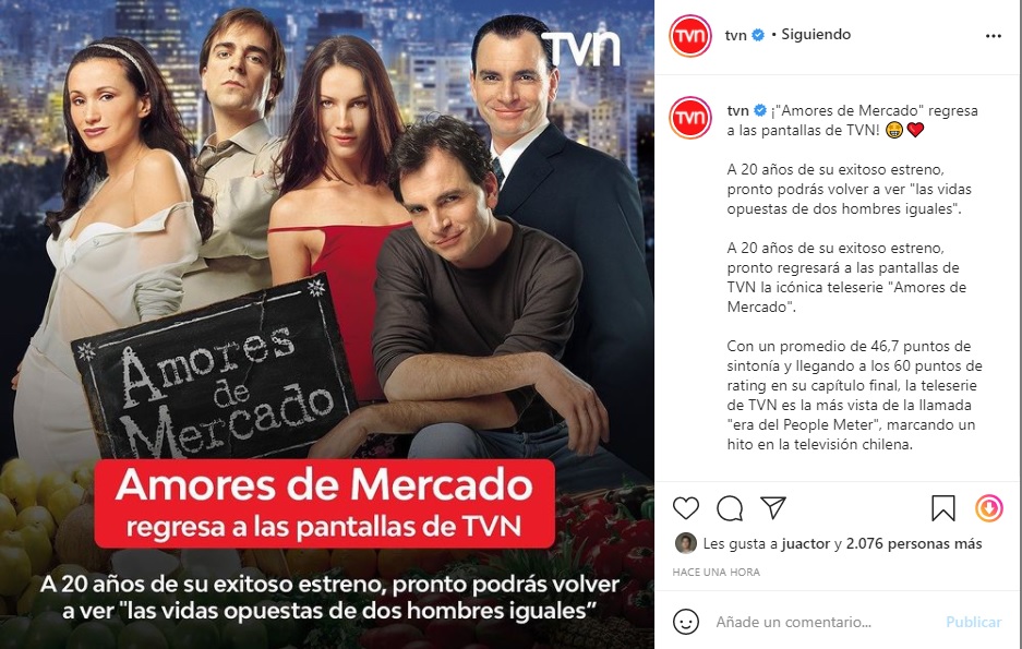 De acuerdo a lo que señaló TVN en su cuenta de Instagram, «Amores de mercado» marcó «un promedio de 46,7 puntos de sintonía y llegando a los 60 puntos de rating en su capítulo final, la teleserie de TVN es la más vista de la llamada ‘era del People Meter’, marcando un hito en la televisión chilena».