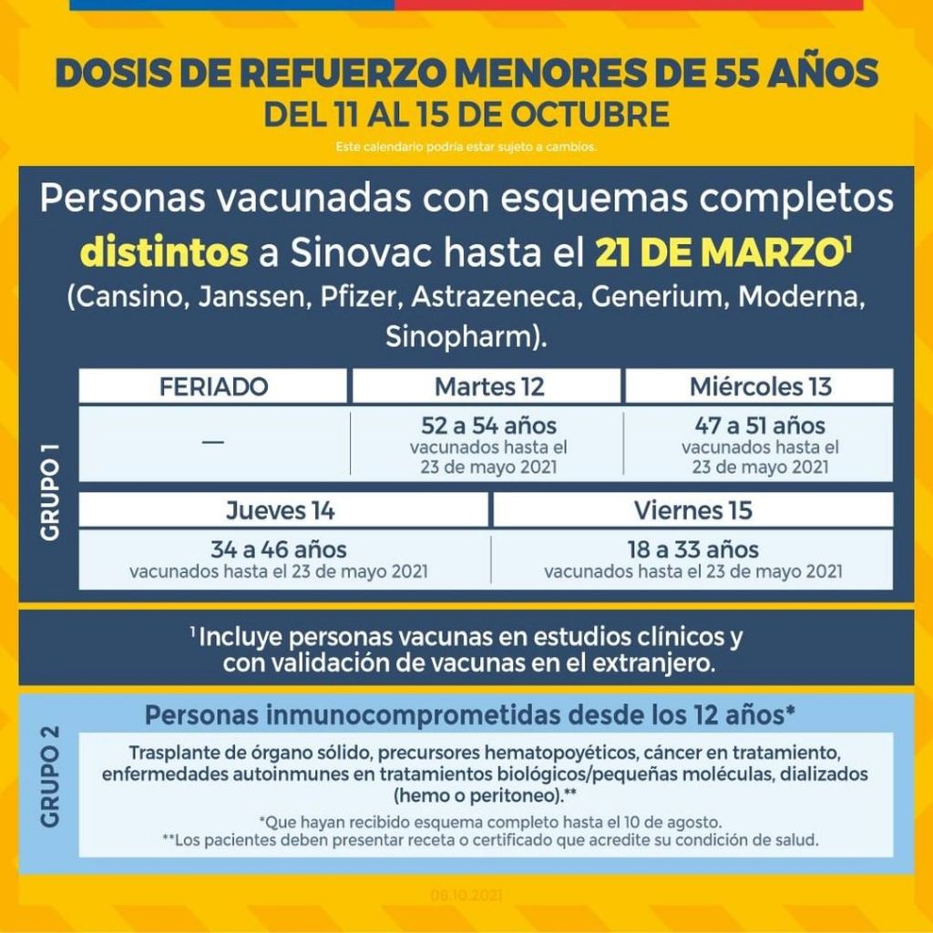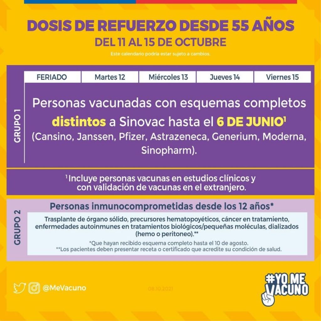 Para esta semana el calendario de vacunación estará enfocado en la dosis de refuerzo. Especialmente para aquellos que recibieron la vacuna de Sinovac, pero a partir de este martes 12 de octubre se incluyen todos los otros tipos de laboratorios con los cuales fueron vacunados los chilenos Cansino; Janssen; Pzifer; Astrazeneca; Generium; Moderna y Sinopharm.