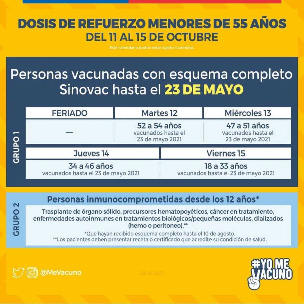 - Viernes 15: Personas entre 18 a 33 años (vacunados con Sinovac hasta el 23 de mayo) / Personas inmunocomprometidas desde los 16 años (trasplante de órgano solido, precursores hematopoyéticos, cáncer en tratamiento) que hayan recibido esquema completo hasta el 10 de agosto.
