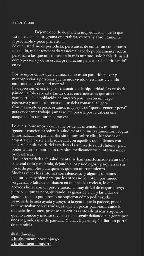“Señor Vasco: Déjeme decirle de manera muy educada, que lo que usted hace en el programa que trabaja, es total y absolutamente reprochable y poco profesional”, escribió de entrada la ex Mekano.