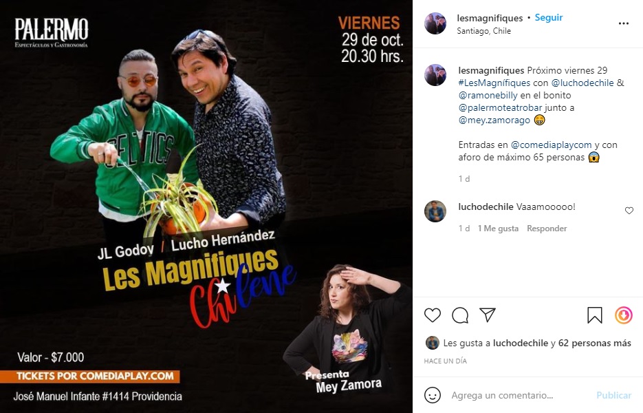 «¡SHOW en Vivo!l@lesmagnifiques volvemos con nuestro Café Concert, llamado «CHILENE». Viernes 29 de octubre en Café Palermo. Aforo reducido. Entradas a la venta por comediaplay.com Presentación de @mey.zamorago ¡Nos vemos en @palermoteatrobar», escribió Luchito en su Instagram.