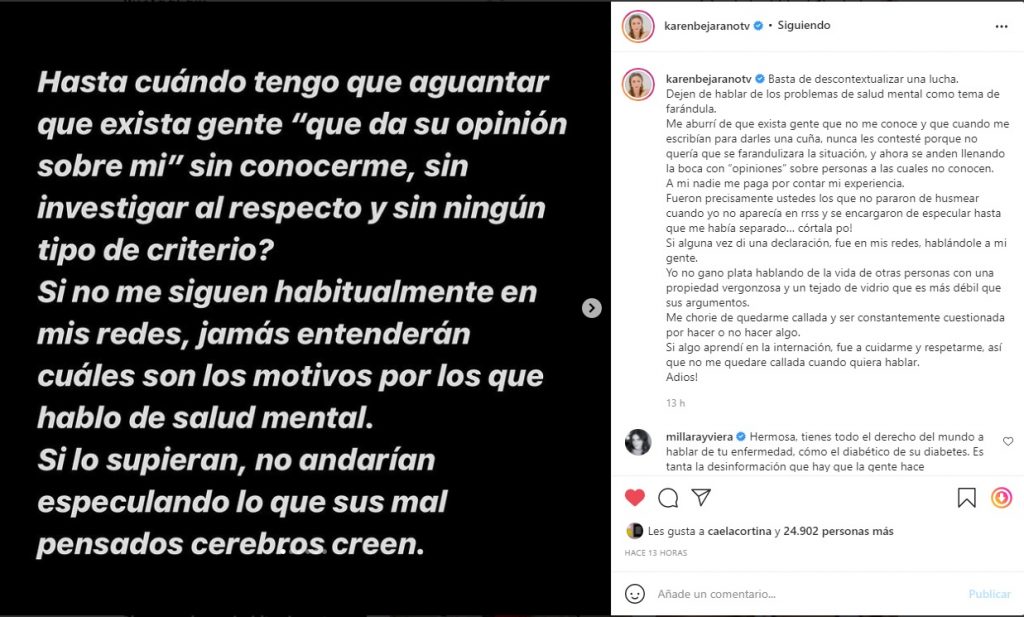 Karen Bejarano decidió aclarar en su cuenta su compromiso con las enfermedades psiquiátricas y su visibilidad.
