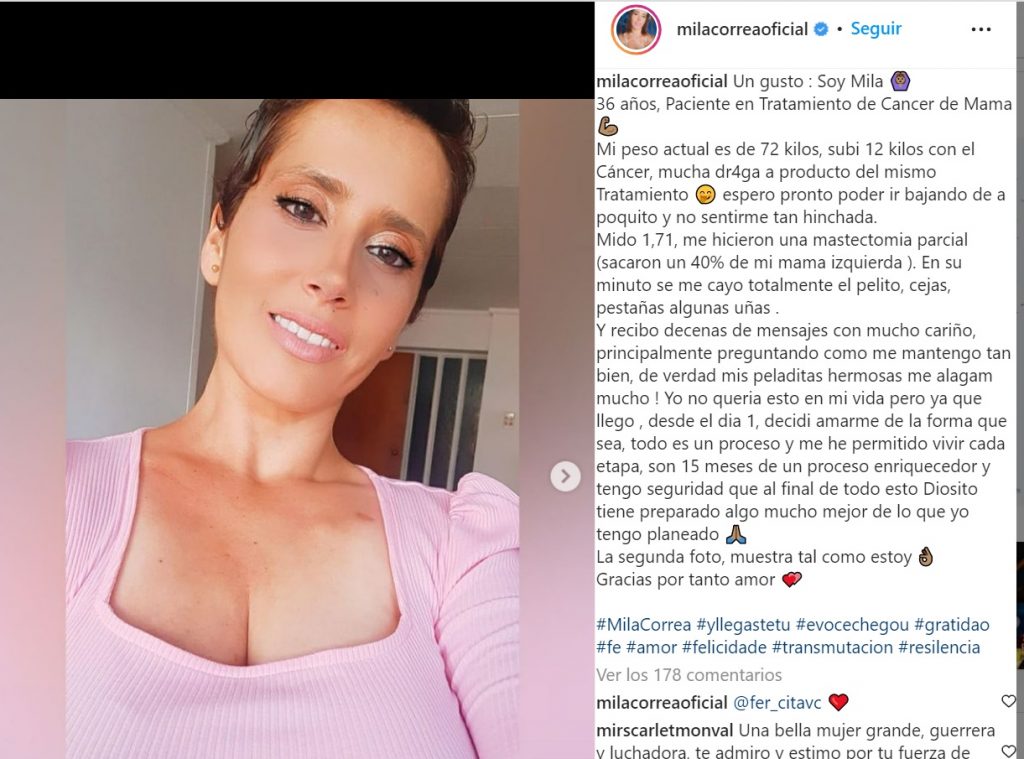 «Un gusto : Soy Mila 🙆🏽♀️36 años, paciente en Tratamiento de Cáncer de Mama; 💪🏽Mi peso actual es de 72 kilos, subí 12 kilos con el Cáncer, mucha droga a producto del mismo tratamiento 🤭 espero pronto poder ir bajando de a poquito y no sentirme tan hinchada», inició Mila Correa en su publicación.