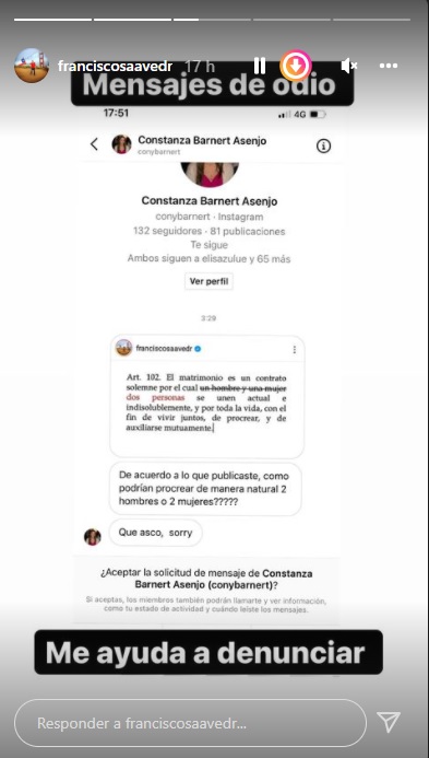 “Mensajes de odio. ¿Me ayudan a denunciar?”, escribió Pancho Saavedra en la foto denunciando públicamente a la usuaria y repudiando la discriminación tras la aprobación del proyecto de ley.