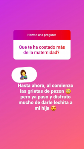 Después del registro subido amamantando a la pequeña Ada, respondió otra pregunta que iba en la misma linea. Ya que aseguró que lo más difícil de su maternidad, fueron sus primeros días al darle leche a su pequeña; pero aquello quedó en el pasado y ahora lo disfruta mucho.