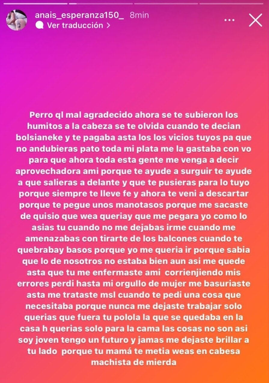 «Pero me da igual, hasta tu ex sabe que eras un cafiche cu… y ahora que tení plata te las das de pobrecito y we… me daría vergüenza en todo caso, yo tampoco quiero seguir con un drogadicto», remató con todo en ese instante.
