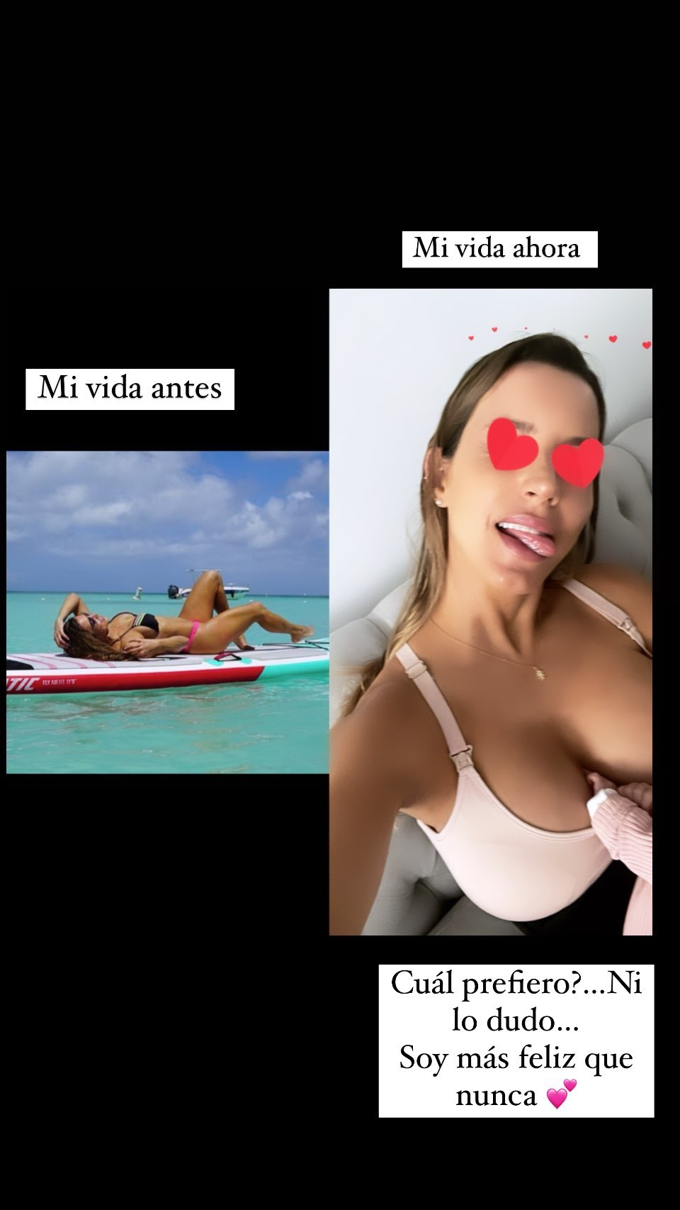 En la comparación se ve por una parte, tomando sol con un traje de baño de colores negro y rosado, sobre un tabla una tabla en el agua. Mientras que en la otra captura está ella con su bebita. Pese a que no muestra la carita de Agustina, ella se exhibe feliz con emojis de corazones en sus ojos y sacando la lengua, al mismo tiempo que parece amamantar a su pequeña bebe.