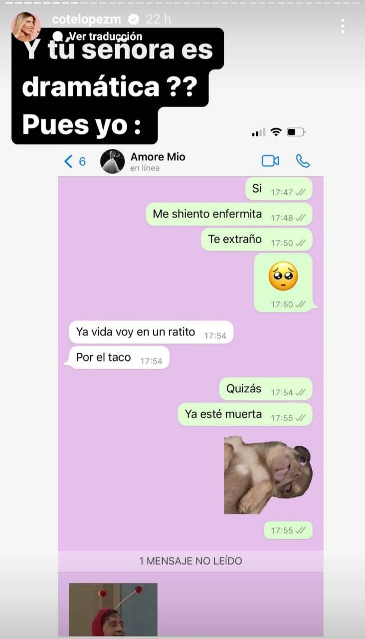 Pero a pesar de no estar muy bien de salud, le puso la cuota de humor al momento. «Y tu señora es dramática? Pues yo:», escribió en su red social compartiendo un conversación con Luis Jiménez exagerando la situación. «Quizás ya esté muerta», añadió en ese contexto.