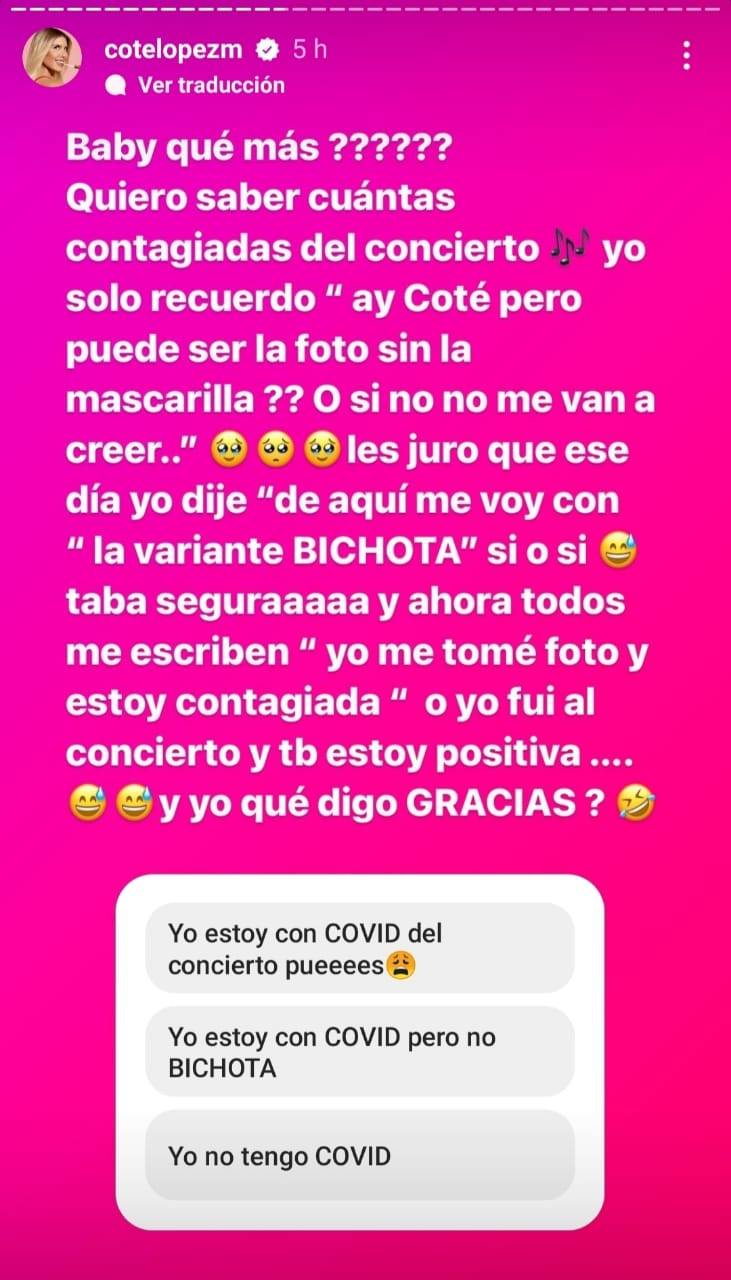 «Baby qué más?? Quiero saber cuántas contagiadas del concierto. Yo solo recuerdo: ‘Ay Coté, pero puede ser la foto sin mascarilla?? O si no, no me van a creer…’, les juro que ese día yo dije: «De aquí me voy con ‘la variante BICHOTA’ si o si», escribió a través de sus historias en la red social confirmando que le llegan mensajes de gente que fue al show y salió contagiada.