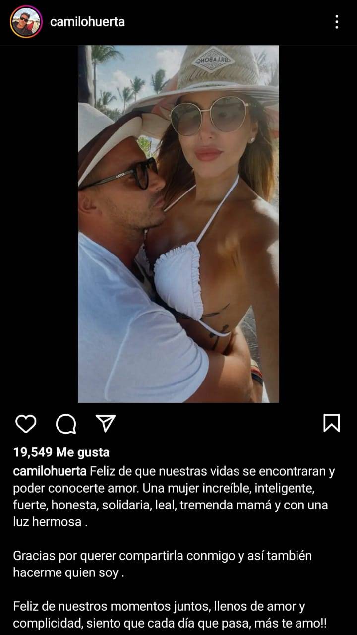 «Feliz de que nuestras vidas se encontraran y poder conocerte amor. Una mujer increíble, inteligente, fuerte, honesta, solidaria, leal, tremenda mamá y con una luz hermosa», expresó Camilo Huerta a través de su cuenta personal con una romántica foto con la joven famosilla.