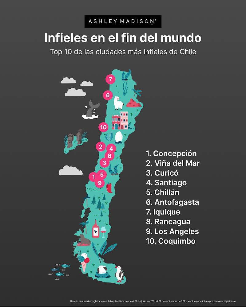 «Ha llegado el clima más frío y nuestro resumen de ciudades invernales muestra los destinos más populares de todo Chile para aquellos interesados en explorar la no monogamia», asegura Christoph Kraemer, el director de comunicaciones de Ashley Madison.