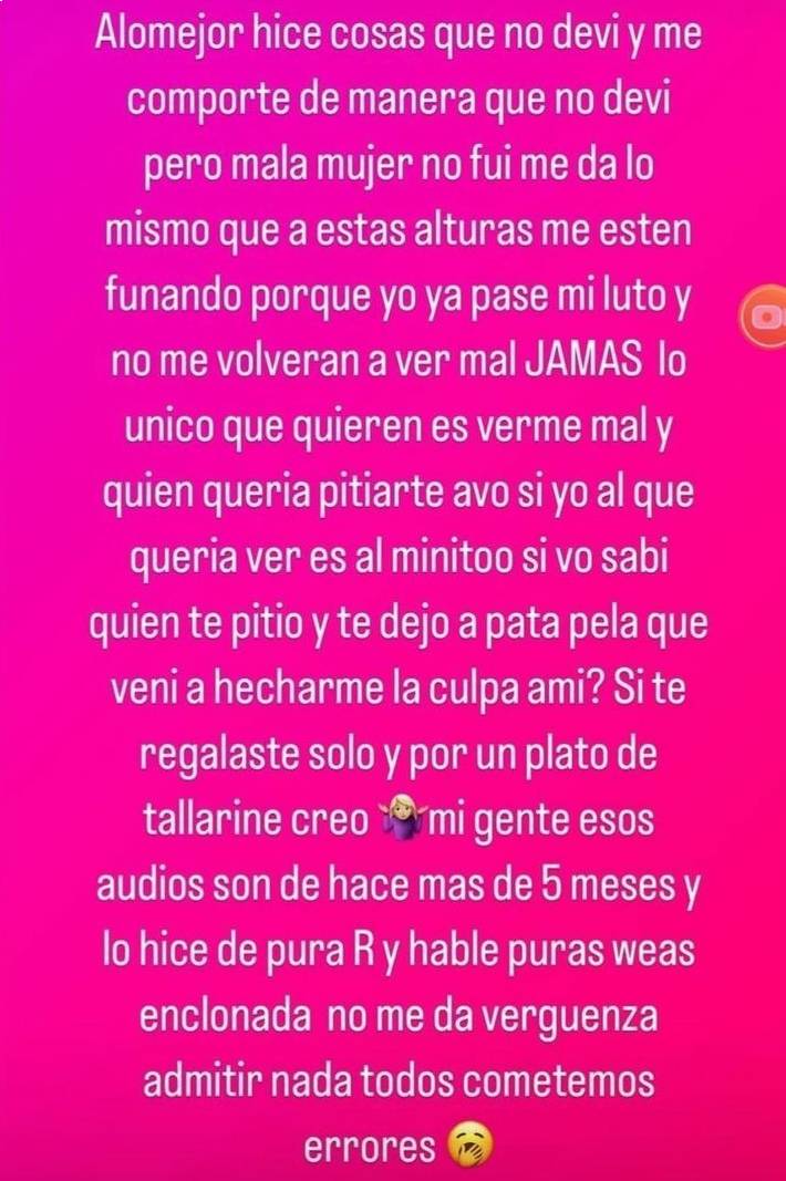 Mientras que Anaís Vilches también respondió a través de su Instagram, admitiendo que hizo cosas malas en su pasado. «Mi gente, esos audios son hace más de 5 meses y lo hice de pura R y hable puras weas ‘enclonada’. No me da vergüenza admitir nada, todos cometemos error», respondió la ex pareja del cantante chileno.