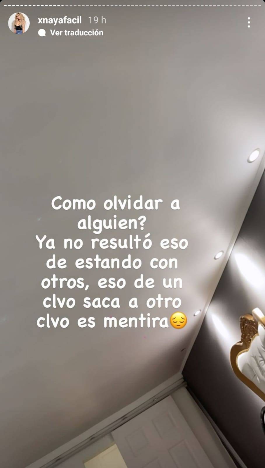 «Cómo olvidar a alguien? Ya no resultó eso de estando con otros, eso de un clavo saca a otro clavo es mentira», inició Naya Fácil con un triste mensaje través las historias de su red social.