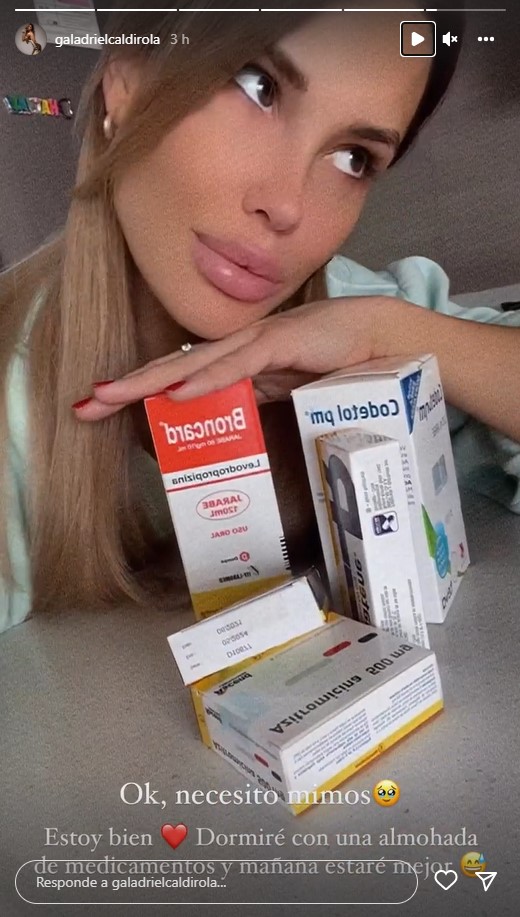 «Ok, necesito mimos. Estoy bien. Dormiré con una almohada de medicamentos y mañana estaré mejor», complementó Gala Caldirola después de subir un breve video.