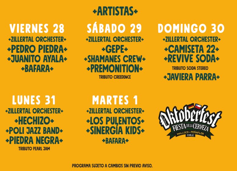 Entre los invitados al Oktoberfest Chile 2022 destacan Pedro Piedra, Juanito Ayala, Gepe, Shamanes Crew, Javiera Parra, entre otros, junto a Zillertal Orquesta que tiene más de 60 años de historia interpretando música tirolesa.