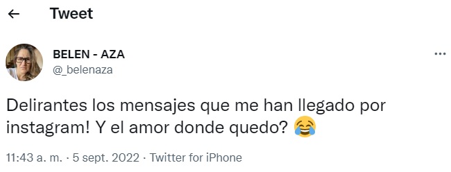 «Delirantes los mensajes que me han llegado por instagram! Y el amor donde quedo? 😂», remató Belén Mora dejando la grande en su cuenta de Twitter.