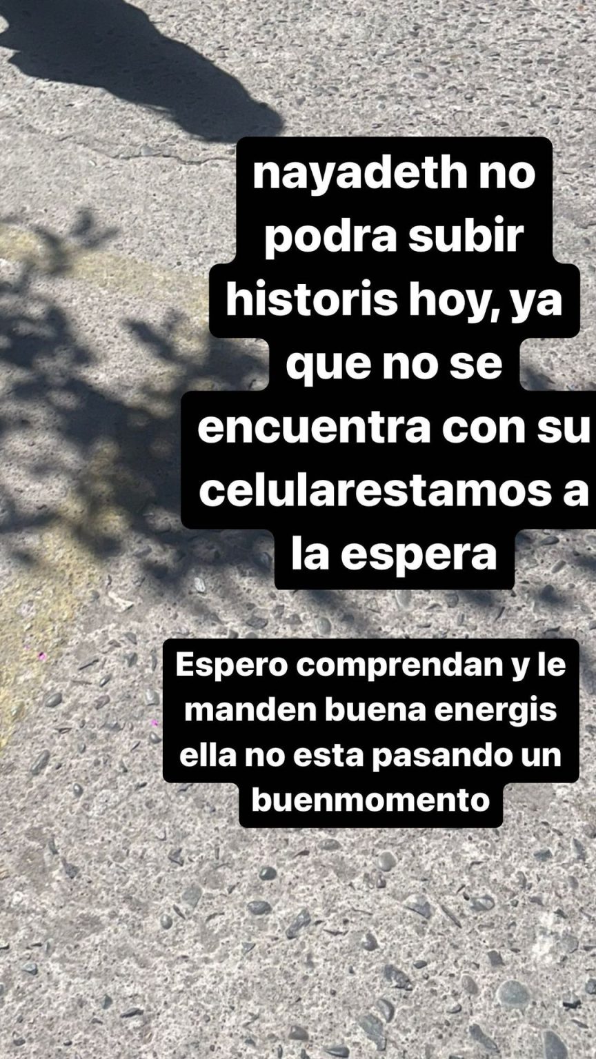 «Nayadeth no podrá subir historias hoy, ya que no se encuentra con su celular, estamos a la espera», comenzó diciendo el enigmático escrito, que fue acompañado por una postal del suelo.