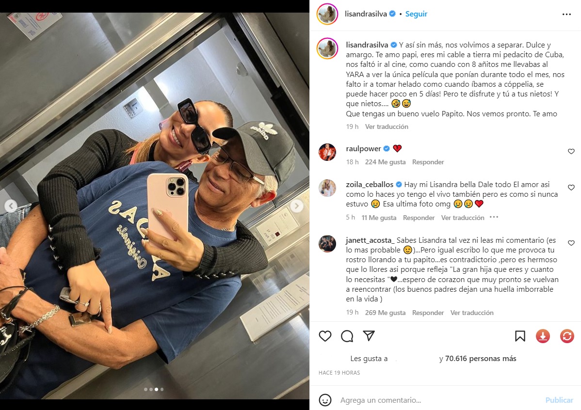 Asimismo, Lisandra Silva agregó: «te amo papi, eres mi cable a tierra mi pedacito de Cuba, nos faltó ir al cine, como cuando con 8 añitos me llevabas al YARA a ver la única película que ponían durante todo el mes, nos falto ir a tomar helado como cuando íbamos a cóppelia, se puede hacer poco en 5 días!», recordó la chiquilla de forma emotiva.