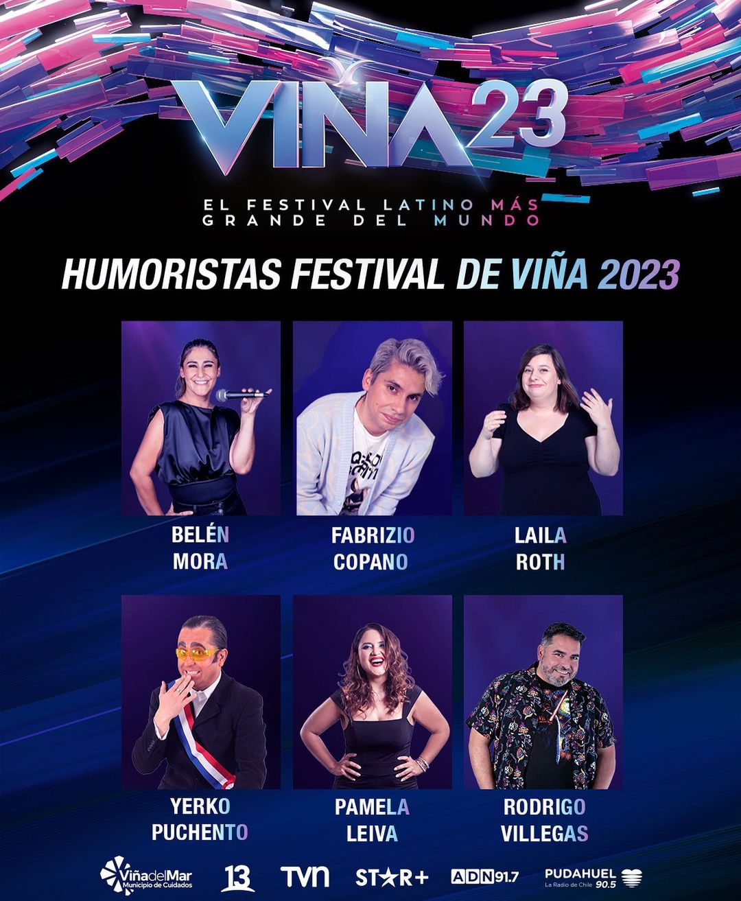 en el humor estarán presentes Daniel Alcaíno con su personaje de «Yerko Puchento», Belén Mora, Pamela Leiva, Rodrigo Villegas, Fabrizio Copano y la argentina Laila Roth.