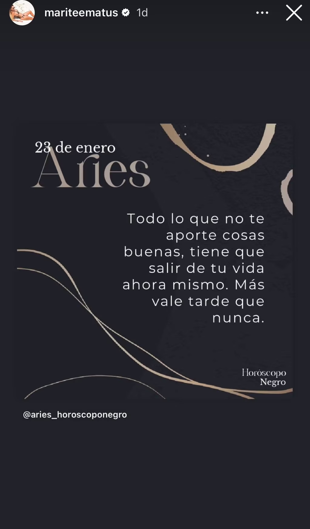 Pero el temita no se quedó solo en esa especulación. La periodista sacó al baile una reciente publicación de Marité Matus, donde compartió una frase del Horóscopo Negro de su signo (Aries).