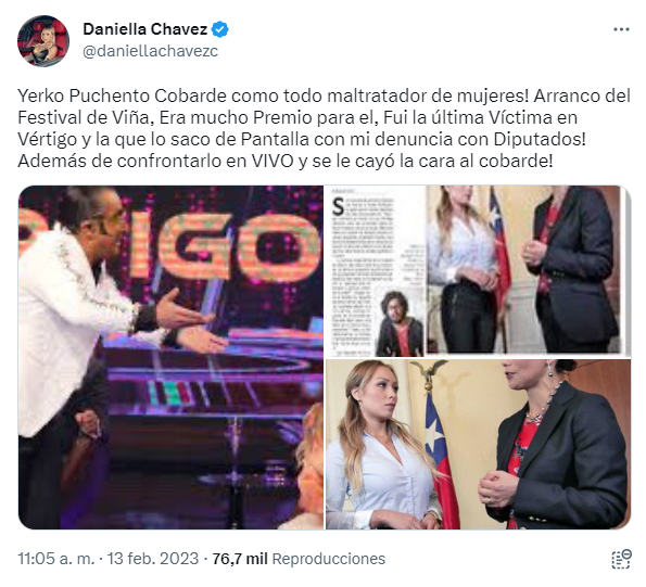 «Yerko Puchento, cobarde como todo maltratador de mujeres. Arrancó del Festival de Viña, era mucho premio para él», partió publicando Daniella Chavez.