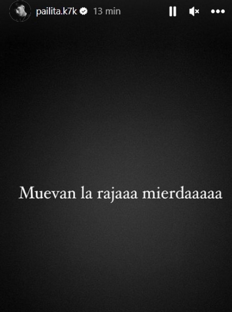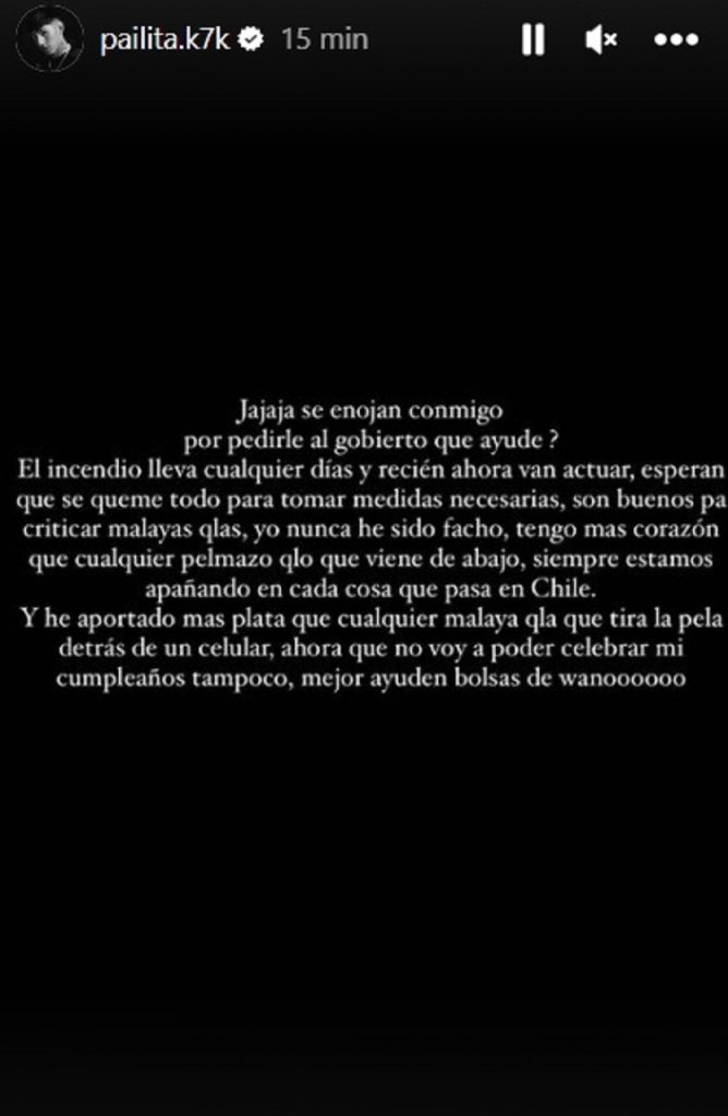 Igualmente, el cantante chileno agregó: «Son buenos para criticar malayas cu… yo nunca he sido facho, tengo más corazón que cualquier pelmazo cu… que viene de abajo, siempre estamos apañando en cada cosa que pasa en Chile», complementó, según pudo rescatar ADN Radio, previo a que Pailita borrara las historias.