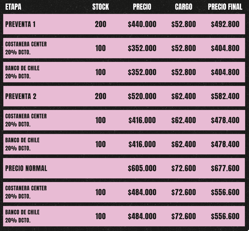 Recuerda que el comienzo de la venta de entradas es este jueves 10 de agosto, mediante el sistema de Ticketmaster. Ahí estarán disponibles para adquirirse los tickets Early Bird y los pases para tres días en Preventa 1 en adelante. Además, habrá descuentos con la aplicación del Costanera Center y también una cantidad limitada para clientes del Banco de Chile.