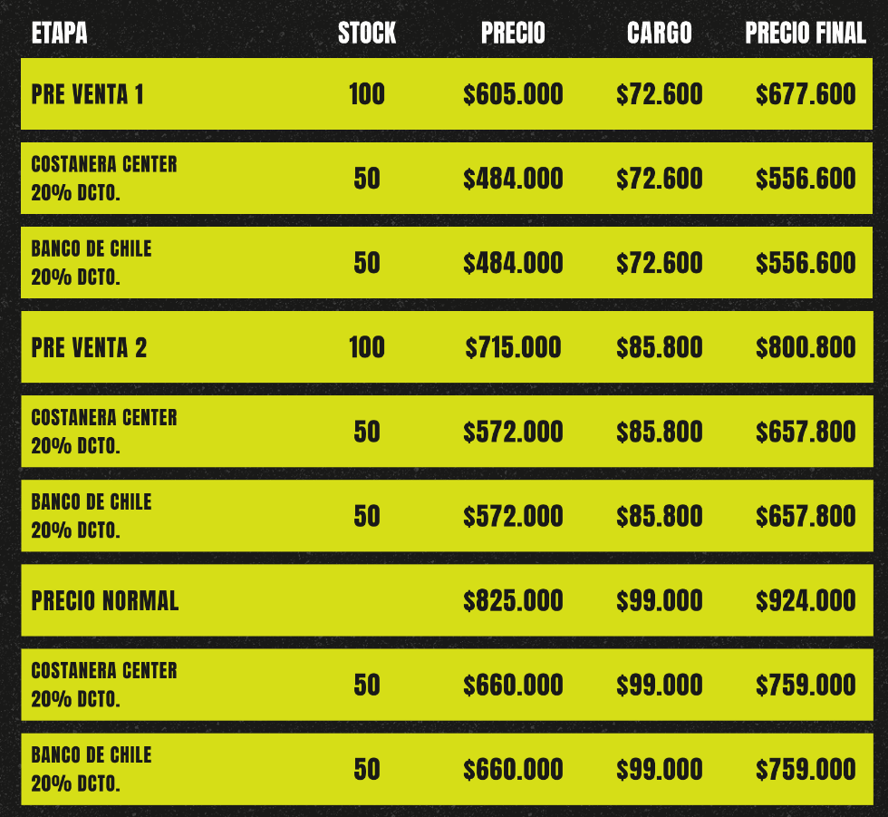 Los valores en esta opción van desde los $128 mil (con una cantidad limitada de 2500 entradas) hasta más de $240 mil en la primera etapa de preventa. Los precios subirán para la preventa 2 hasta llegar a más de $347 mil de la venta normal.