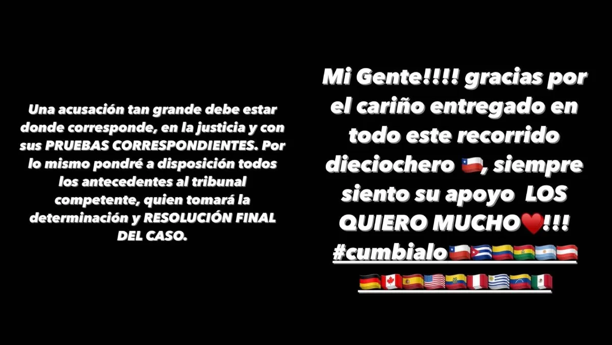 «Una acusación tan grande debe estar donde corresponde, en la justicia y con sus PRUEBAS CORRESPONDIENTES. Por lo mismo pondré a disposición todos los antecedentes al tribunal competente, quien tomará la determinación y RESOLUCIÓN FINAL DEL CASO», complementó el reconocido cantante chileno.