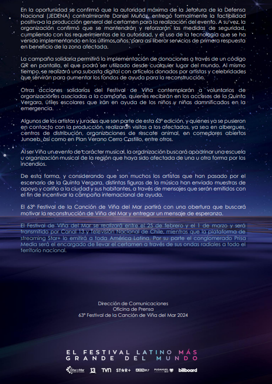 A continuación te dejamos el comunicado entregado por parte de la organización del Festival de Viña del Mar.