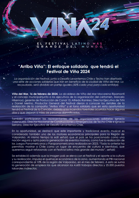 Bajo el mismo punto, anunciaron que harán un cambio en lo que respecta a las recaudaciones que tenga el Festival. En concreto, este se va a dividir en partes iguales, las cuales iguan 50% para la organización de Viña 2024 y 50% para Desafío Levantemos Chile y Techo.