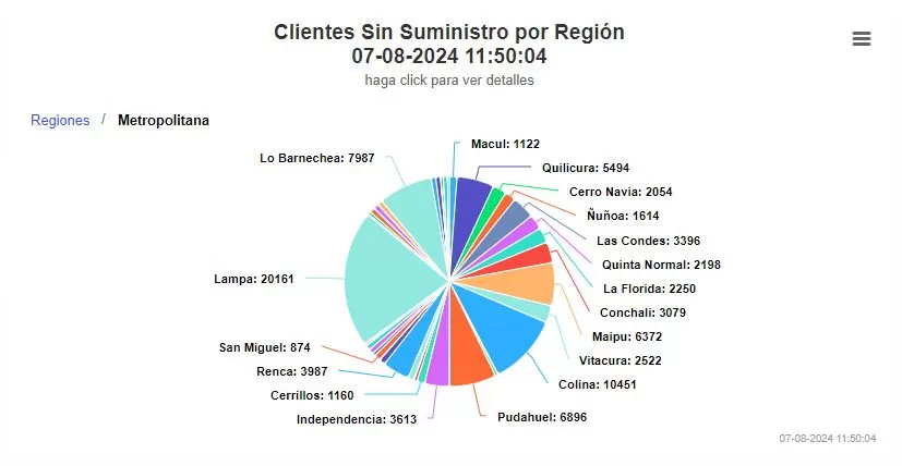 Según la información de la Superintendencia de Electricidad y Combustibles (SEC), a las 11:50 de este miércoles 7 de agosto, todavía hay más de 95.000 clientes afectados por cortes de luz en la Región Metropolitana.