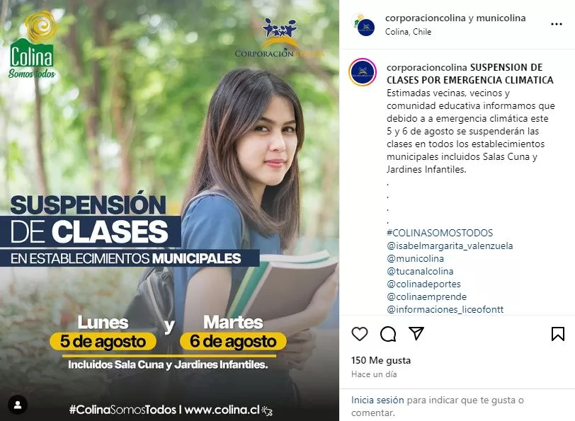 Cabe destacar que en el caso de Colina, la medida aplica para todos los establecimientos municipales, incluyendo jardines infantiles y sala cunas.