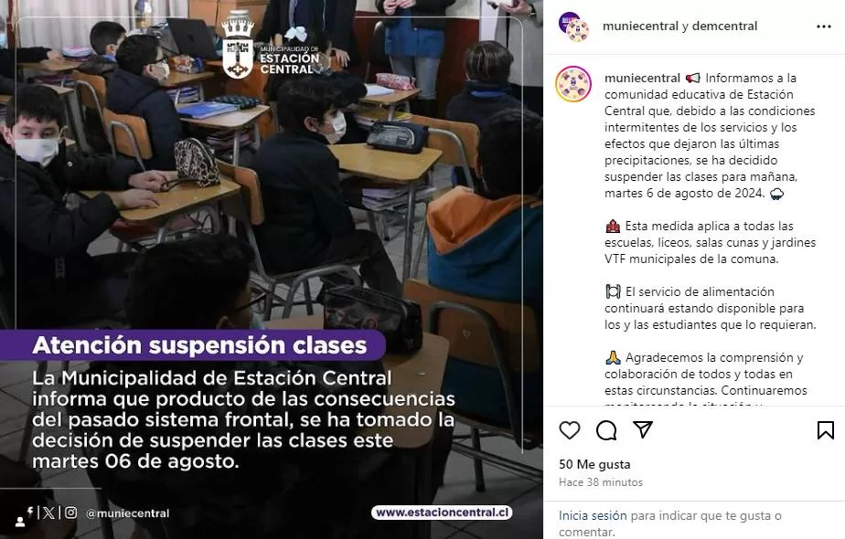 De momento, algunas comunas de la Región Metropolitana han informado la suspensión de clases en establecimientos educacionales municipales para el martes 6 agosto. Nos referimos a Colina, Lampa y Estación Central.