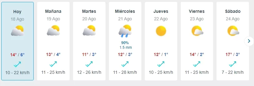 Por otro lado, cabe destacar que se espera que la máxima de hoy, domingo 18 de agosto, sea de 14 grados.