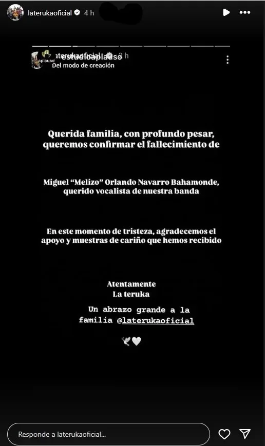 «Querida familia, con profundo pesar, queremos confirmar el fallecimiento de Miguel ‘Melizo’ Orlando Navarro Bahamonde, querido vocalista de nuestra banda. En este momento de tristeza agradecemos el apoyo y muestras de cariño que hemos recibido», indicó la agrupación.