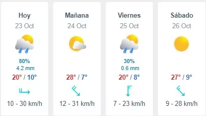 Mientras que en el transcurso del sábado 26 de octubre, la máxima llegaría a 27 grados y la mínima a 13 grados.