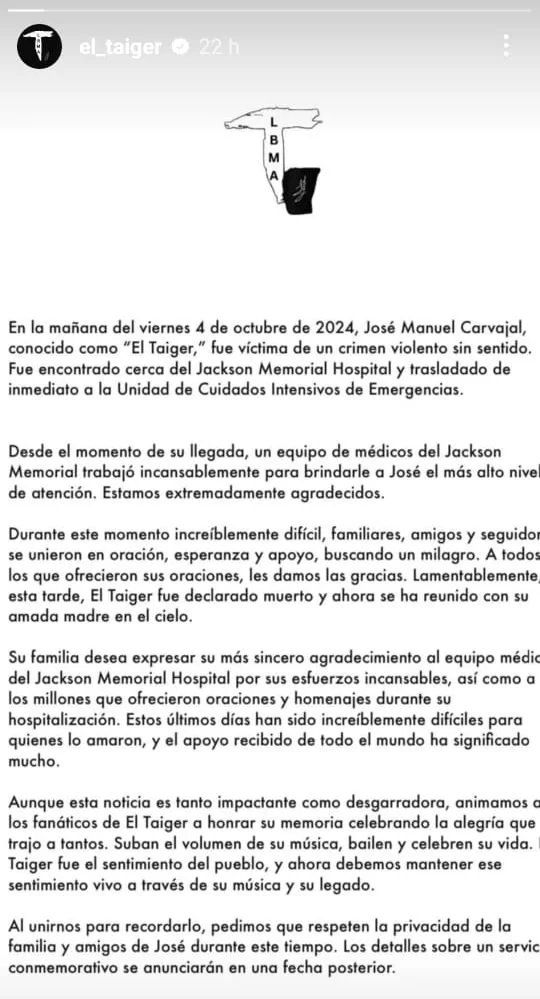 «Lamentablemente, esta tarde, El Taiger fue declarado muerto y ahora se ha reunido con su amada madre en el cielo», se informó a través de la cuenta de Instagram del artista, la acumula más de 1 millón de seguidores.
