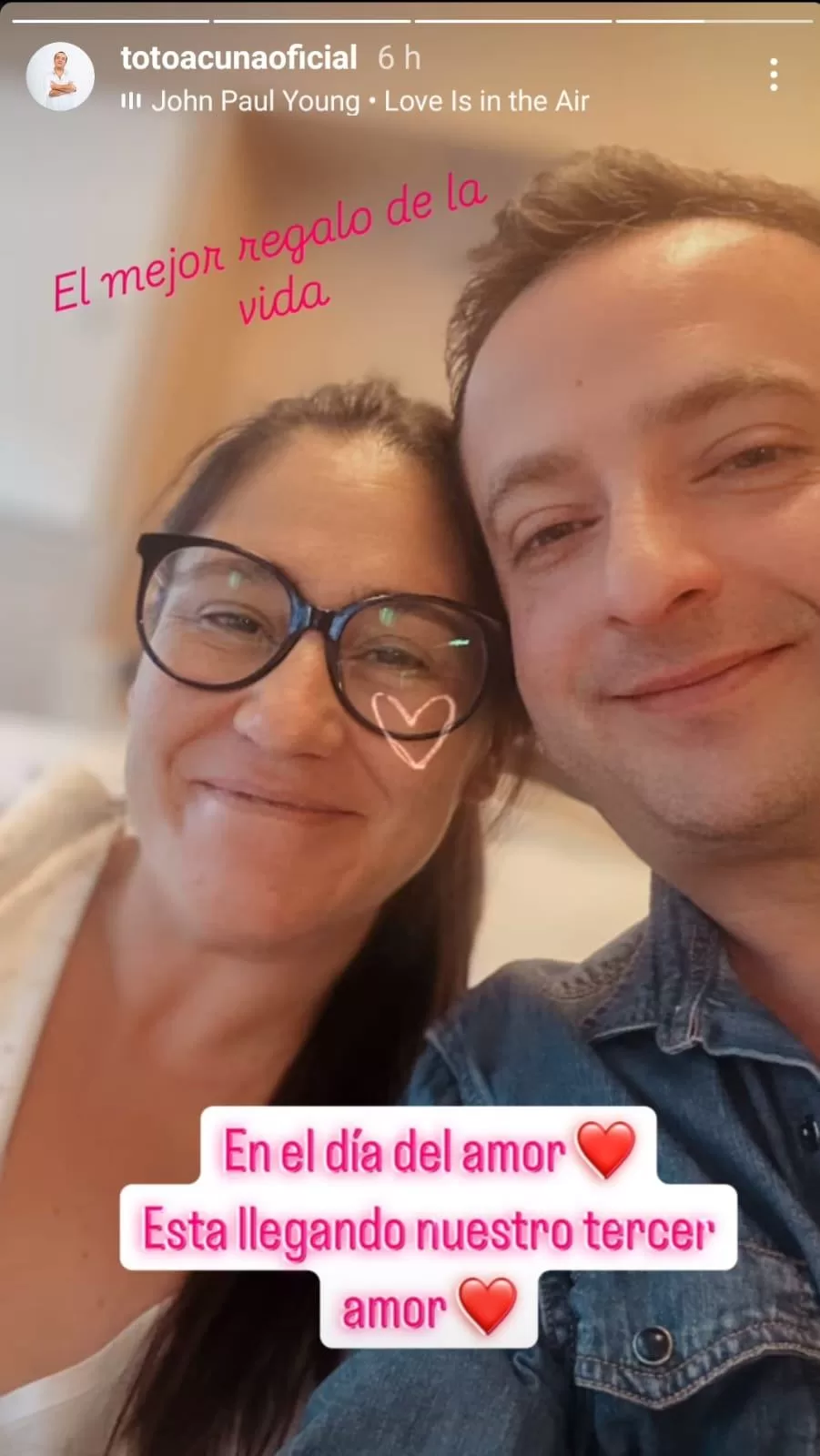 Además, Toto Acuña compartió una historia, en la que aparece con Belén Mora. En este sentido señaló: «El mejor regalo de la vida. En el día del amor, está llegando nuestro tercer amor».