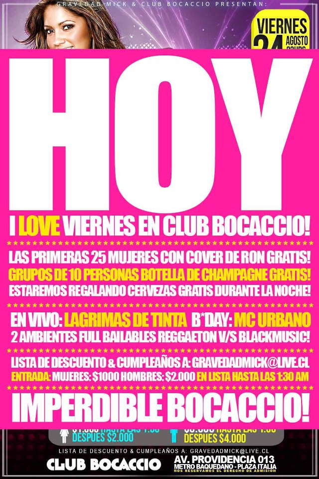 Celebra que ya llegó el fin de semana con la fiesta “I Love Viernes” en el Bocaccio! Habrá un montón de regalos, como jelly shots para todos, ron para las chicas más prendidas de la noche, y los grupos de 10 personas recibirán una botella champaña gratis. Todo al son del reggaeton, los hits radiales […]