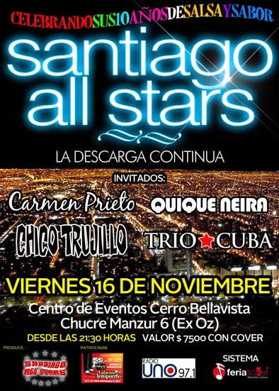«Santiago all stars», se llama la movida que hoy parte a las nueve y media de la noche en la Ex Oz, y que justamente celebra los 10 años de esta sabrosa banda. Además, contarán con destacados artistas invitados como Chico Trujillo y Quique Neira, para hacerte bailar toooda la noche. No te […]
