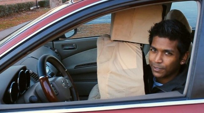 Un aburrido joven decidió asustar a un par de chiquillas con un camuflado disfraz de asiento de auto, que al estar puesto en la parte superior de su cuerpo, generaba el efecto de estar sin conductor.