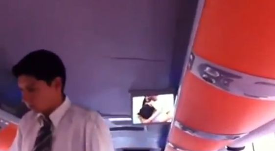 En las imágenes se puede ver cómo el auxiliar se pasea por el pasillo del bus, sin percatarse que en las pantallas de TV, estaba emitiéndose una película pornográfica.