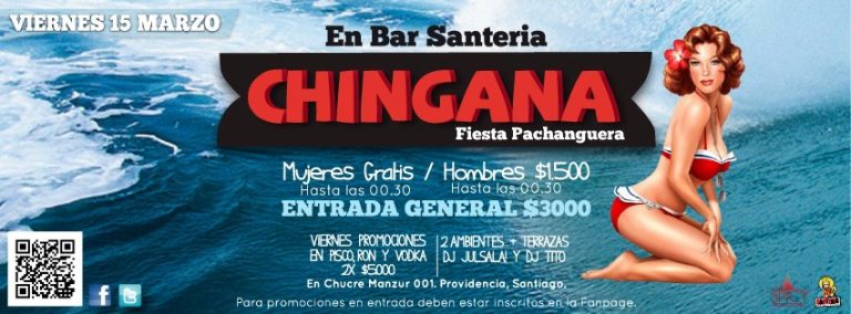 Vuelve a Bar Santería, “Chingana. Fiesta Pachanguera” con los mejores hits del verano y toda la pachanga que te hará bailar como loco. En su terraza al aire libre podrás disfrutar de su promoción de ron, pisco y vodka 2 X 5 lucas toda la noche. Entrada a $1.500 hasta las 00:30 hrs.