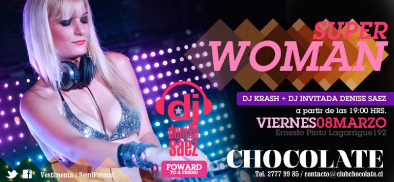 “Super woman” se llama la fiesta que celebra el Día Internacional de la Mujer. Habrá un increíble show sorpresa y happy hour desde las 19.00 horas. Eso sí, a esta fiesta se entra con tenida semi formal poshombre. En Club Chocolate, las entradas están a $5.000 mujeres, $7000 hombres.